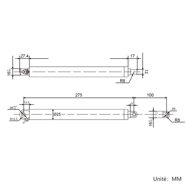 | Longueur de rétraction | 275mm (distance entre les centres des deux trous de montage lorsque le vérin électrique est entièrement rétracté) |