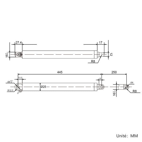 | Longueur de rétraction | 445mm (distance entre les centres des deux trous de montage lorsque le vérin électrique est entièrement rétracté) |