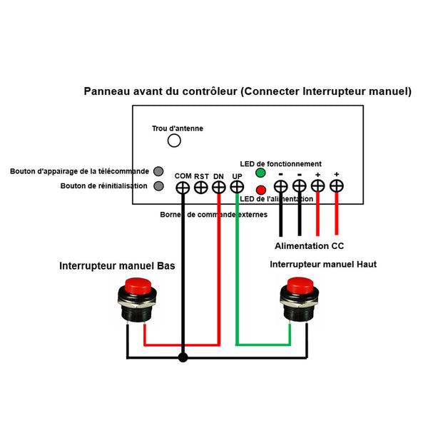 2) Connectez deux bornes du bouton Haut aux bornes <UP> et <COM> du contrôleur, et connectez deux bornes du bouton Bas aux bornes <DOWN> et <COM> du contrôleur.