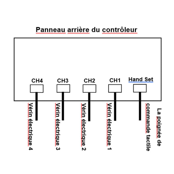 2) Branchez quatre vérins électriques dans les ports CH1, CH2, CH3 et CH4 du contrôleur.