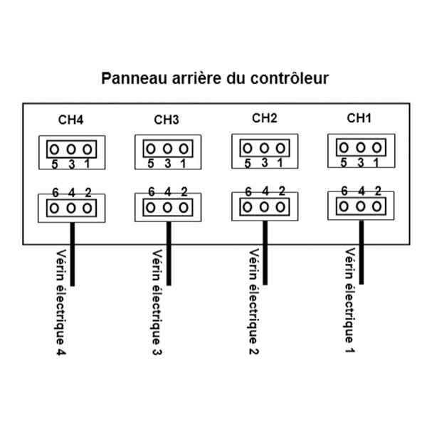 2) Branchez deux bornes de chacun des quatre vérins électriques aux deux ports des CH1, CH2, CH3 et CH4 du contrôleur respectivement.