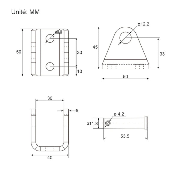 1. Chaque verin électrique nécessiterait deux supports de montage, un pour fixer la tête du vérin électrique et un autre pour fixer le bas du vérin électrique. Ce kit contient deux supports de montage fixes G .Vous pouvez également acheter le Support de disque circulaire de montage de la tête (Modèle 0043075) et Support de plaque plate de montage du bas (Modèle 0043076) à partir du menu déroulant.