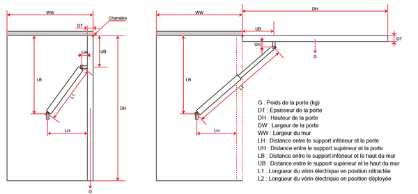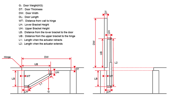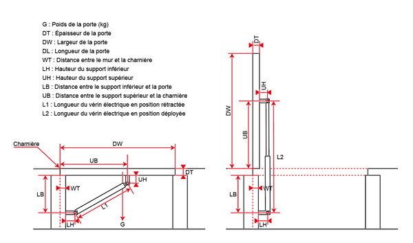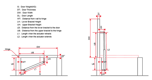 Si le poids de votre équipement (comme une trappe) est de 100 kg et que vous souhaitez utiliser un ou plusieurs vérins électriques pour l'ouvrir, vous devez calculer la force réelle agissant sur le vérin électrique en fonction de votre méthode d'installation. Cette force est généralement de 3-6 fois le poids de l'équipement.