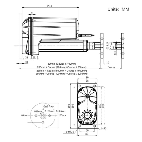Si vous les commandez ensemble, nous aplatissons la partie du trou de montage du connecteur arrière du vérin électrique F à l'aide de la fraiseuse, et personnaliserons le connecteur arrière du vérin électrique F dans le style avec un filetage externe M27, puis fixerons ce support de plaque plate à la base du vérin électrique avec un écrou M27, une vis M8 et six vis M4.