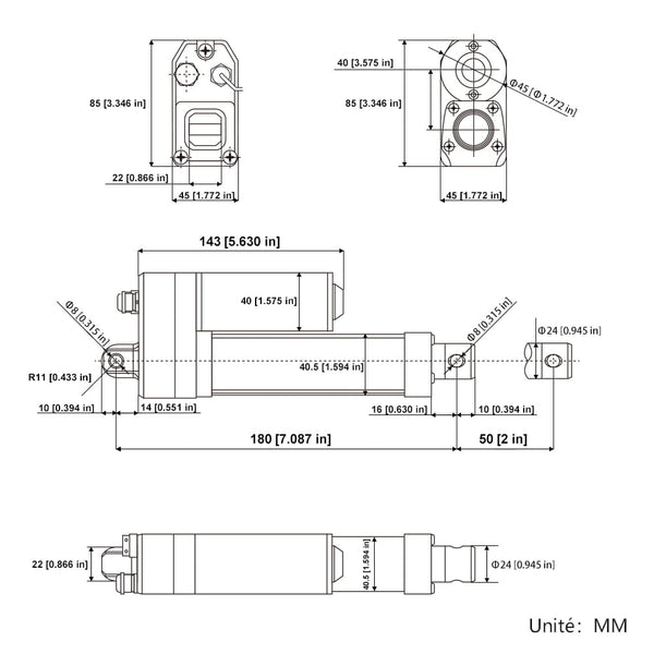 Longueur de rétraction : lorsque le vérin électrique est entièrement rétracté, la distance centrale entre les deux trous de montage est de 180 MM.