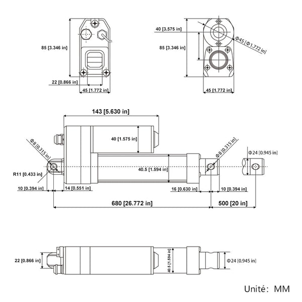 Longueur de rétraction : lorsque le vérin électrique est entièrement rétracté, la distance centrale entre les deux trous de montage est de 680 MM.
