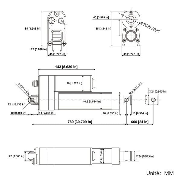Longueur de rétraction : lorsque le vérin électrique est entièrement rétracté, la distance centrale entre les deux trous de montage est de 780 MM.