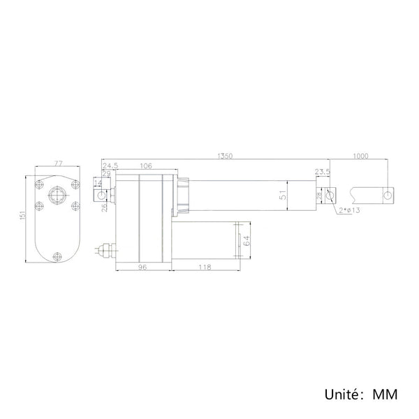 Longueur de rétraction : lorsque le vérin électrique est entièrement rétracté, la distance centrale entre les deux trous de montage est de 1350 MM.