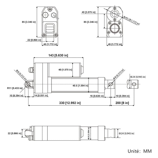 Longueur de rétraction : lorsque le vérin électrique est entièrement rétracté, la distance centrale entre les deux trous de montage est de 330 MM.