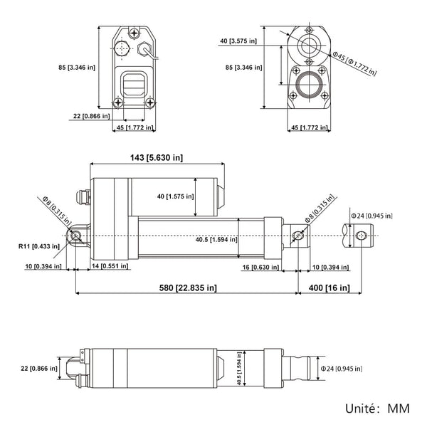 Longueur de rétraction : lorsque le vérin électrique est entièrement rétracté, la distance centrale entre les deux trous de montage est de 580 MM.