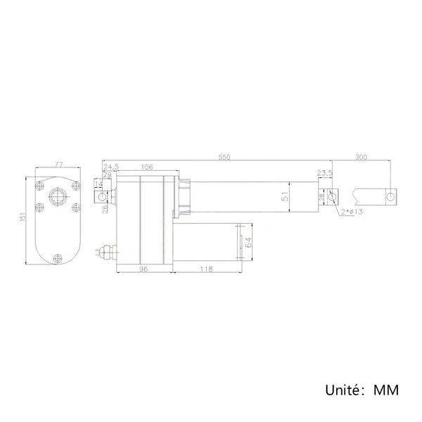Longueur de rétraction : lorsque le vérin électrique est entièrement rétracté, la distance centrale entre les deux trous de montage est de 550 MM.