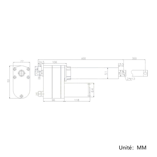 Longueur de rétraction : lorsque le vérin électrique est entièrement rétracté, la distance centrale entre les deux trous de montage est de 600 MM.