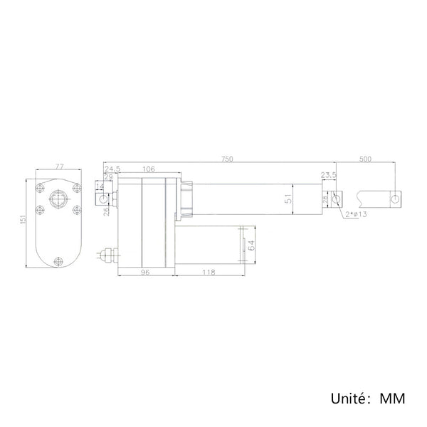 Longueur de rétraction : lorsque le vérin électrique est entièrement rétracté, la distance centrale entre les deux trous de montage est de 750 MM.