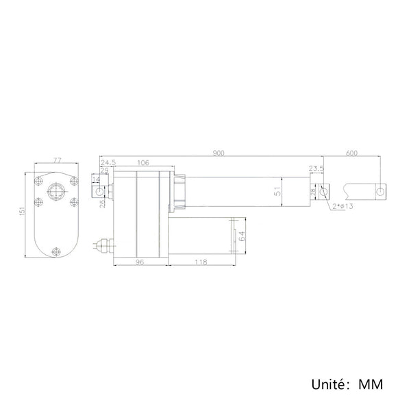 Longueur de rétraction : lorsque le vérin électrique est entièrement rétracté, la distance centrale entre les deux trous de montage est de 900 MM.